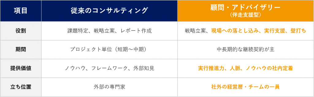 従来のコンサルティングやスポットのアドバイザーは、「戦略立案」や「課題の特定」を主目的とすることが一般的でした。しかし、それだけではいずれ「実行の壁」に突き当ってしまいます。
