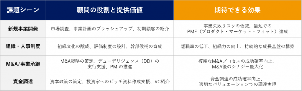 - 最適な提携先の探索: 事業のアライアンス先や、M&Aの候補先など、顧問のネットワークを通じて最適なビジネスパートナーを迅速に見つけ出します。