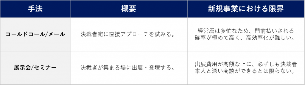 決裁者にアプローチするための手法はありますが、新規事業や成長企業にとっては限界があります。